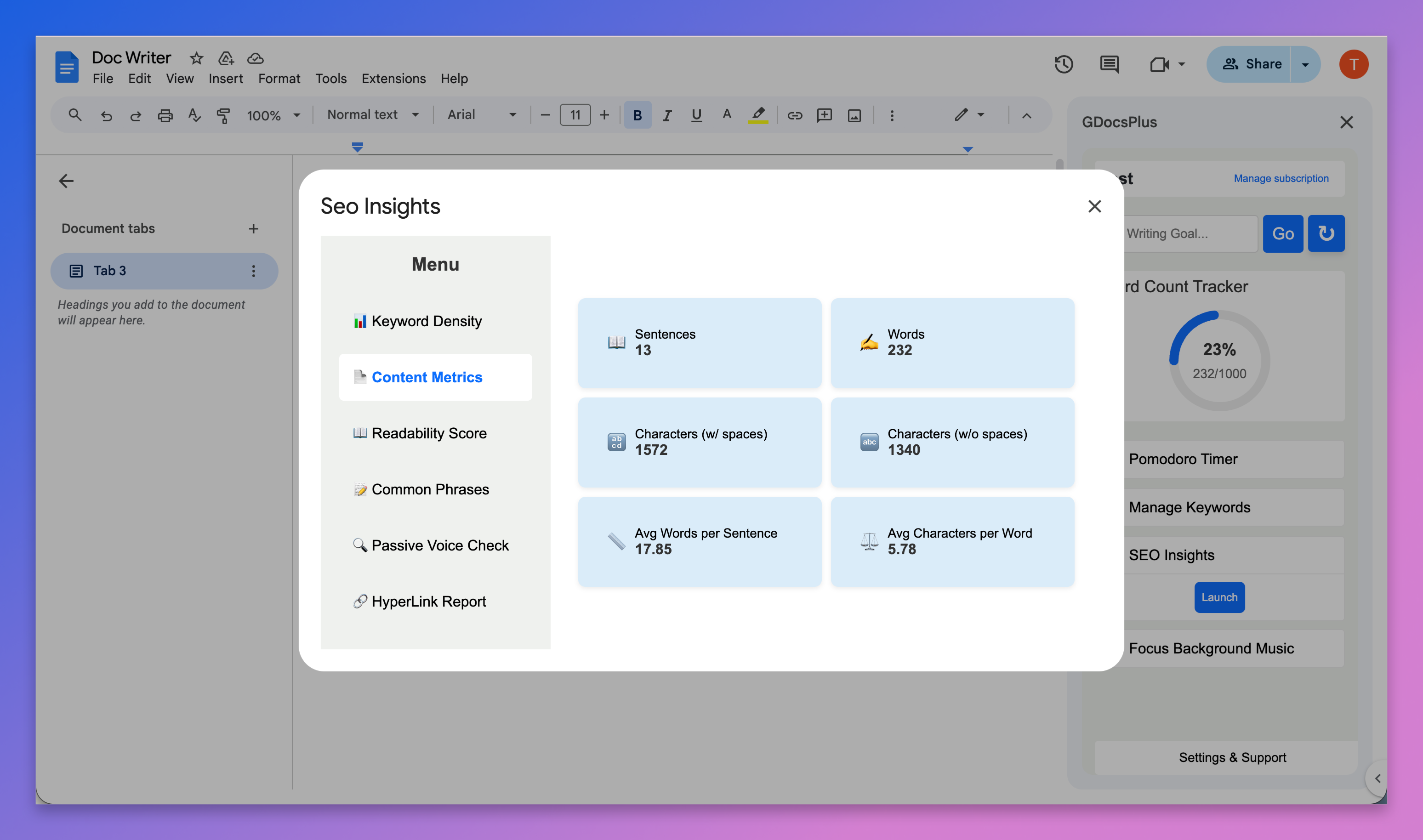 With all the tools you need in one place — keyword density, readability, content metrics, passive voice detection, and more — you’ll write faster, edit smarter, and publish with confidence. It’s like having an editor, SEO specialist, and writing coach all built into Google Docs.